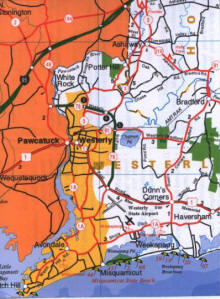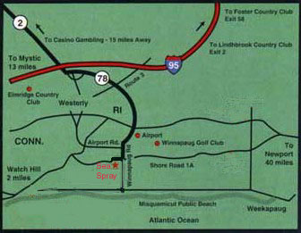On Route 78: Continue on to signal light. Cross Route 1 intersection to Airport Road. At the stop sign, take a left onto Winnapaug Road. Turn right at the traffic light onto Shore Road (1A). The two buildings of the Sea Spray Inn are painted bright yellow and are immediately on the left. |
